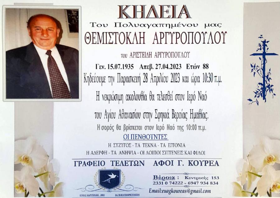 Κηδεύεται αύριο Παρασκευή 28 Απριλίου 2023 και ώρα 10.30 το πρωί ο Θεμιστοκλής, Αριστείδη, Αργυρόπουλος, 88 ετών. Η νεκρώσιμη ακολουθία θα τελεσθεί στον Ιερό Ναό Αγίου Αθανασίου στην Σφηκιά Δήμου Βέροιας.