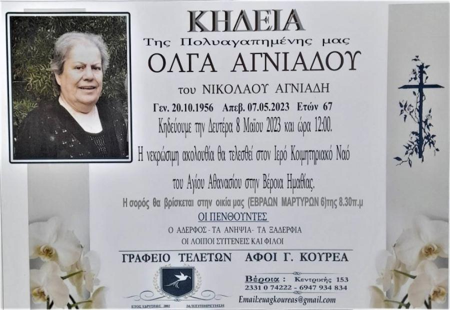 Κηδεύεται σήμερα Δευτέρα 08 Μαίου 2023 και ώρα 12.00 το μεσημέρι η Όλγα, Νικολάου, Αγνιάδου, 67 ετών. Η νεκρώσιμη ακολουθία θα τελεσθεί στον Ιερό Ναό Αγίου Αθανασίου (Κοιμητήρια) στη Βέροια.
