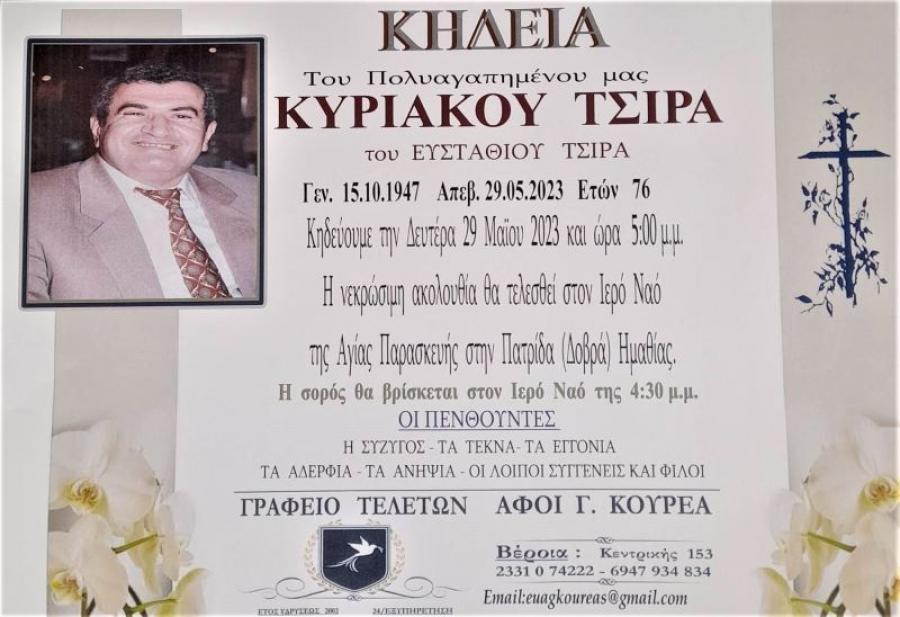 Κηδεύεται σήμερα Δευτέρα 29 Μαϊου 2023 και ώρα 5.00 το απόγευμα ο Κυριάκος, Ευσταθίου, Τσιράς, 76 ετών. Η νεκρώσιμη ακολουθία θα τελεσθεί στον Ιερό Ναό Αγίας Παρασκευής στην Πατρίδα Δήμου Βέροιας. Ο σορός θα βρίσκεται στον Ιερό Ναό στις 4.30 μ.μ.