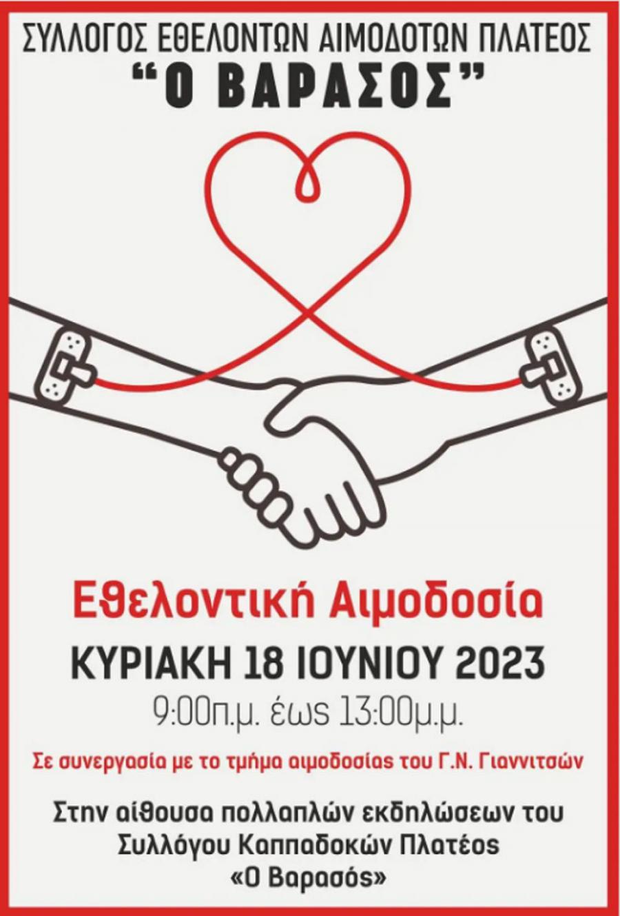 ην Κυριακή 18 Ιουνίου 2023, ο Σύλλογος Εθελοντών Αιμοδοτών Πλατέος “ο Βαρασός” διοργανώνει Εθελοντική αιμοδοσία στην αίθουσα πολλαπλών εκδηλώσεων του Συλλόγου, από τις 9:00 το πρωί έως τις 13:00 το μεσημέρι, σε συνεργασία με το τμήμα αιμοδοσίας του Γ/Ν Γιαννιτσών.