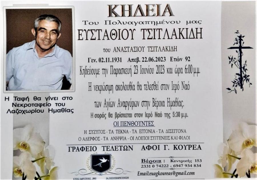 Κηδεύεται σήμερα Παρασκευή 23 Ιουνίου 2023 και ώρα 6.00 το απόγευμα, ο Ευστάθιος, Αναστασίου, Τσιτλακίδης, 92 ετών. Η νεκρώσιμη ακολουθία θα τελεσθεί στον Ιερό Ναό των Αγίων Αωαργύρων στη Βέροια.