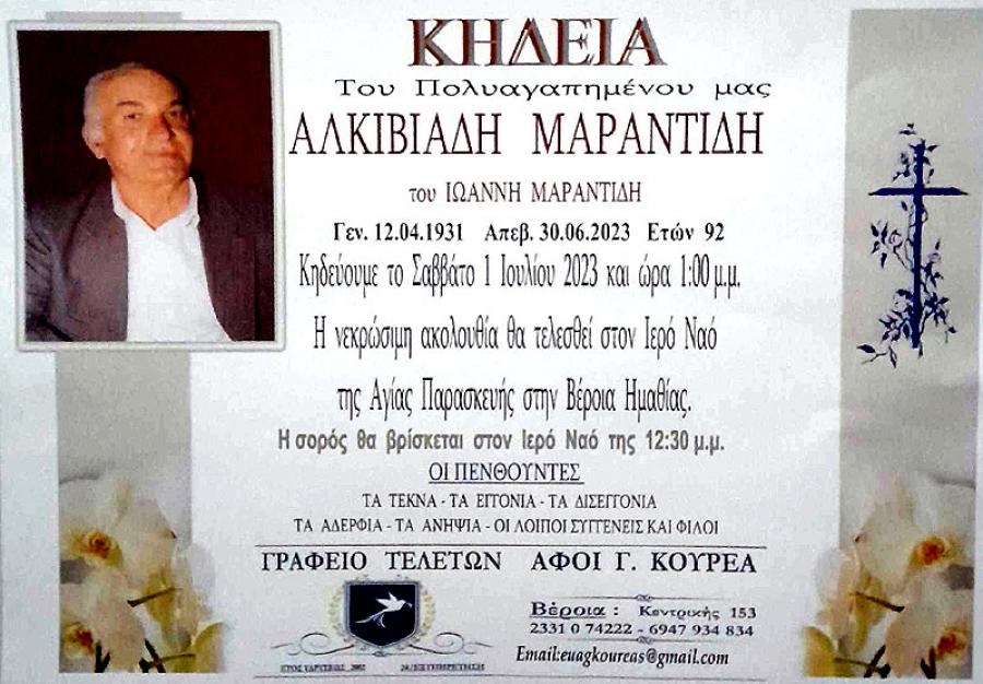 Κηδεύεται αύριο Σάββατο 01 Ιουλίου 2023 και ώρα 1.00 το μεσημέρι, ο Αλκιβιάδης, Ιωάννη, Μαραντίδης, 92 ετών. Η νεκρώσιμη ακολουθία θα τελεσθεί στον Ιερό Ναό Αγίας Παρασκευής στη Βέροια. Ο σορός θα βρίσκεται στον Ιερό Ναό στις 12.30 μ.μ.
