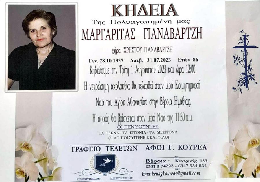 Κηδεύεται αύριο Τριτη 01 Αυγούστου 2023 και ώρα 12.00 το μεσημέρι, η Μαργαρίτα, χήρα Χρήστου, Γιαναβαρτζή, 86 ετών. Η νεκρώσιμη ακολουθία θα τελεσθεί στον Ιερό Ναό του Αγίου Αθανασίου (Κοιμητήρια) στη Βέροια.