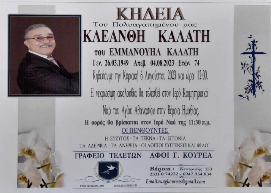 Κηδεύεται σήμερα Κυριακή 06 Αυγούστου 2023 και ώρα 12.00 το μεσημέρι, ο Κλεάνθης, Εμμανουήλ, Καλατής, 74 ετών. Η νεκρώσιμη ακολουθία θα τελεσθεί στον Ιερό Ναό του Αγίου Αθανασίου (Κοιμητήρια) στη Βέροια.