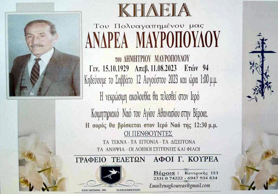 Κηδεύεται αύριο Σάββατο 12 Αυγούστου 2023 και ώρα 1.00 το μεσημέρι, ο Ανδρέας, Δημητρίου, Μαυρόπουλος, 94 ετών. Η νεκρώσιμη ακολουθία θα τελεσθεί στον Ιερό Ναό του Αγίου Αθανασίου (Κοιμητήρια) στη Βέροια.