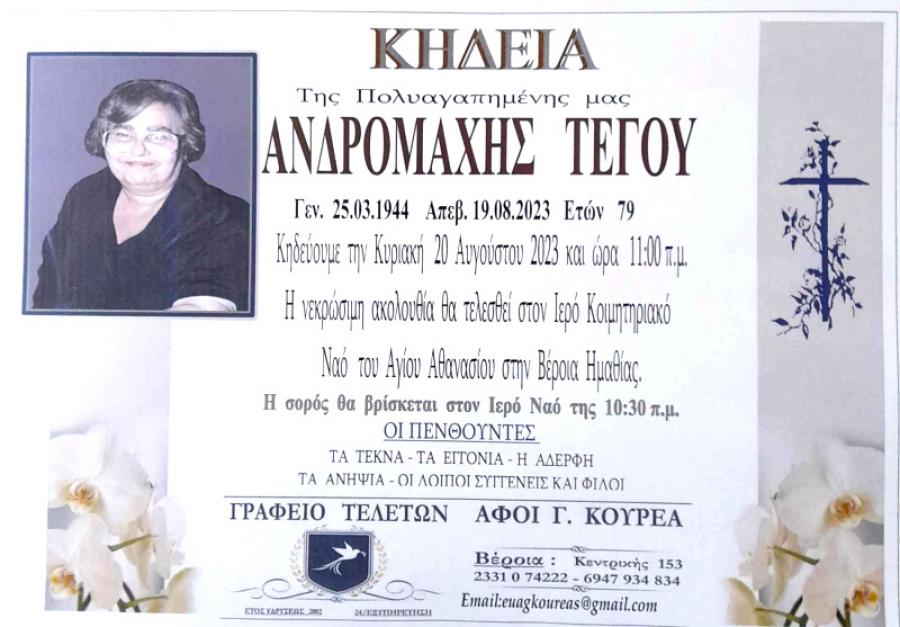Κηδεύεται σήμερα Κυριακή 20 Αυγούστου 2023 και ώρα 11.00 το πρωί, η Ανδρομάχη Τέγου, 79 ετών. Η νεκρώσιμη ακολουθία θα τελεσθεί στον Ιερό Ναό του Αγίου Αθανασίου (Κοιμητήρια) στη Βέροια. Η σορός θα βρίσκεται στον Ιερό Ναό στις 10.30 π.μ..