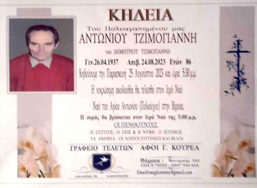 Κηδεύεται αύριο Παρασκευή 25 Αυγούστου 2023 και ώρα 5.30 το απόγευμα, ο Αντώνιος, Δημητρίου, Τζιμογιάννης, 86 ετών. Η νεκρώσιμη ακολουθία θα τελεσθεί στον Ιερό Ναό του Αγίου Αντωνίου (Πολιούχος) στη Βέροια.