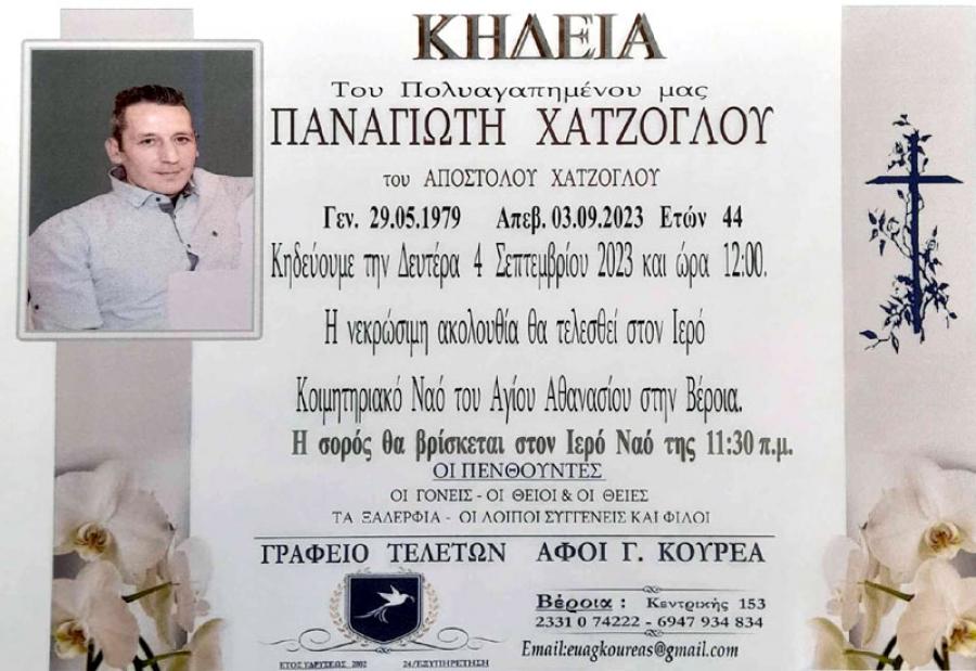 Κηδεύεται αύριο Δευτέρα 4 Σεπτεμβρίου 2023 και ώρα 12.00 το μεσημέρι, ο Παναγιώτης, Απόστολου, Χατζόγλου, 44 ετών. Η νεκρώσιμη ακολουθία θα τελεσθεί στον Ιερό Ναό του Αγίου Αθανασίου (Κοιμητήρια) στη Βέροια.