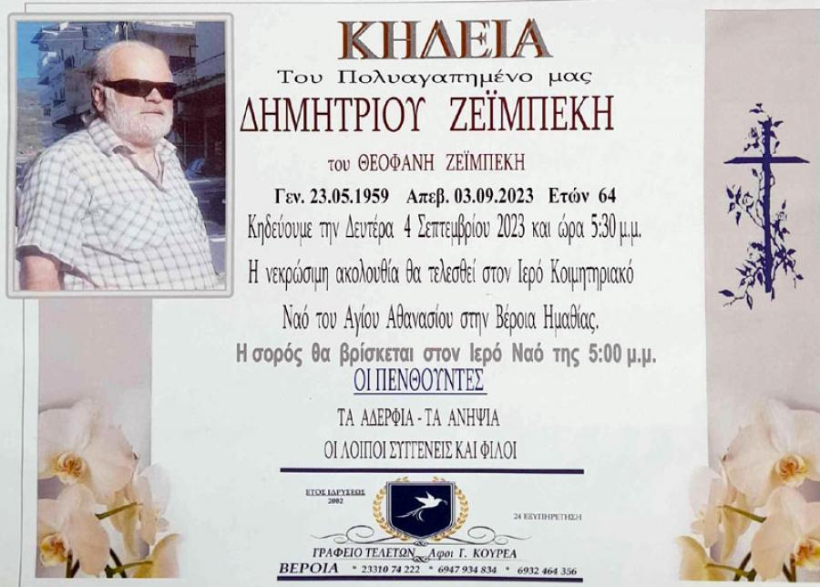 Κηδεύεται σήμερα Δευτέρα 4 Σεπτεμβρίου 2023 και ώρα 5.30 το απόγευμα, ο Δημήτριος, Θεοφάνη, Ζεϊμπέκης, 64 ετών. Η νεκρώσιμη ακολουθία θα τελεσθεί στον Ιερό Ναό του Αγίου Αθανασίου (Κοιμητήρια) στη Βέροια.