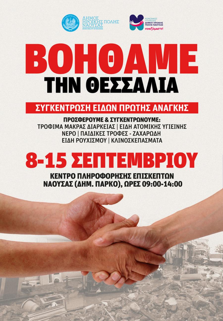 Ο Δήμος Νάουσας και το Νομικό Πρόσωπο Κοινωνικής Προστασίας και Αλληλεγγύης καλούν τους δημότες, που έχουν τη δυνατότητα, να προσφέρουν είδη πρώτης ανάγκης (τρόφιμα μακράς διαρκείας, είδη ατομικής υγιεινής, νερά, παιδικές τροφές, είδη ρουχισμού, κλινοσκεπάσματα ) για τους πλημμυροπαθείς συμπολίτες μας στη Θεσσαλία.
