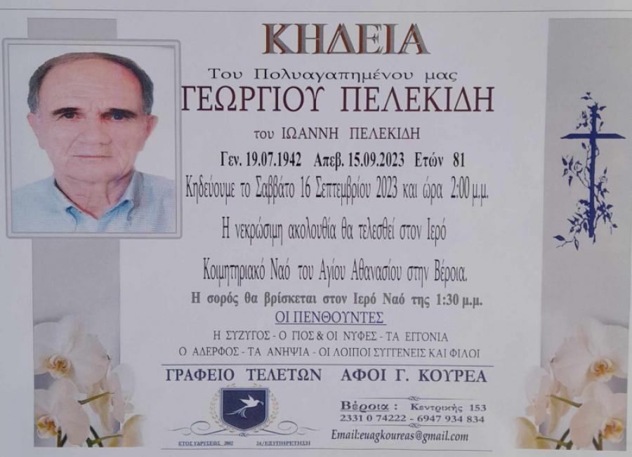 Κηδεύεται αύριο Σάββατο 16 Σεπτεμβρίου 2023 και ώρα 2.00 το μεσημέρι, ο Γεώργιος, Ιωάννη, Πελεκίδης, 81 ετών. Η νεκρώσιμη ακολουθία θα τελεσθεί στον Ιερό Ναό του Αγίου Αθανασίου (Κοιμητήρια) στη Βέροια.