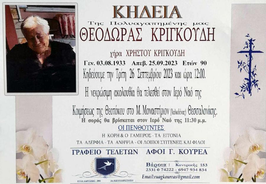 Κηδεύεται αύριο Τρίτη 26 Σεπτεμβρίου 2023 και ώρα 12..00 το μεσημέρι, η Θεοδώρα, χήρα Χρήστου, Κριγκούδη, 90 ετών. Η νεκρώσιμη ακολουθία θα τελεσθεί στον Ιερό Ναό της Κοιμήσεως της Θεοτόκου στο Μ. Μοναστήρι Χαλκηδόνας.
