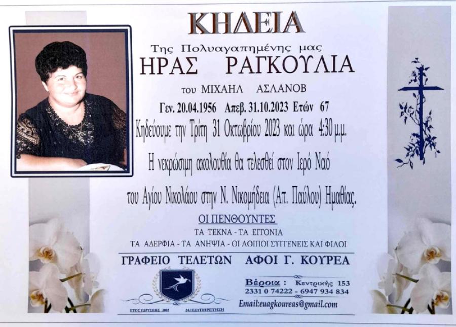 Κηδεύεται σήμερα Τρίτη 31 Οκτωβρίου 2023 και ώρα 4.30 το απόγευμα, η Ήρα, του Μιχαήλ Ασλάνοβ, Ραγκουλιά, 67 ετών. Η νεκρώσιμη ακολουθία θα τελεσθεί στον Ιερό Ναό Αγίου Νικολάου στη Νέα Νικομήδεια Δήμου Βέροιας.