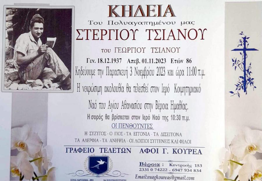 Κηδεύεται αύριο Παρασκευή 03 Νοεμβρίου 2023 και ώρα 11.00 το πρωί, ο Στέργιος, Γεωργίου, Τσιάνος, 86 ετών. Η νεκρώσιμη ακολουθία θα τελεσθεί στον Ιερό Ναό Αγίου Αθανασίου (Κοιμητήρια) στη Βέροια. Η σορός θα βρίσκεται στον Ιερό Ναό στις 10.30 π.μ.