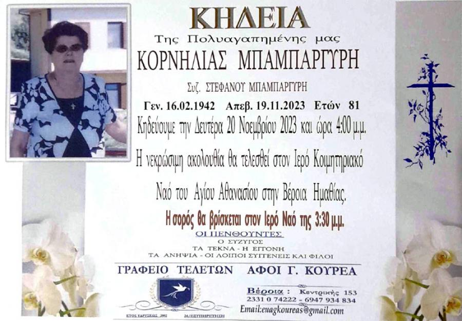 Κηδεύεται αύριο Δευτέρα 20 Νοεμβρίου 2023 και ώρα 4.00 το απόγευμα, η Κορνηλία, συζ. Στεφάνου, Μπαρμπαργύρη, 81 ετών. Η νεκρώσιμη ακολουθία θα τελεσθεί στον Ιερό Ναό Αγίου Αθανασίου (Κοιμητήρια) στη Βέροια.