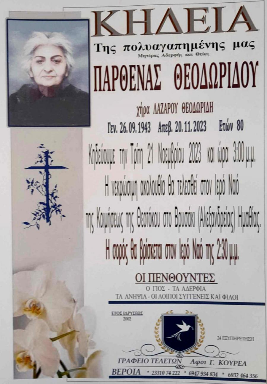 Κηδεύεται σήμερα Τρίτη 21 Νοεμβρίου 2023 και ώρα 3.00 το απόγευμα, η Παρθένα, χήρα Λάζαρου, Θεοδωρίδου, 80 ετών. Η νεκρώσιμη ακολουθία θα τελεσθεί στον Ιερό Ναό της Κοιμήσεως της Θεοτόκου στο Βρυσάκι Αλεξάνδρειας.
