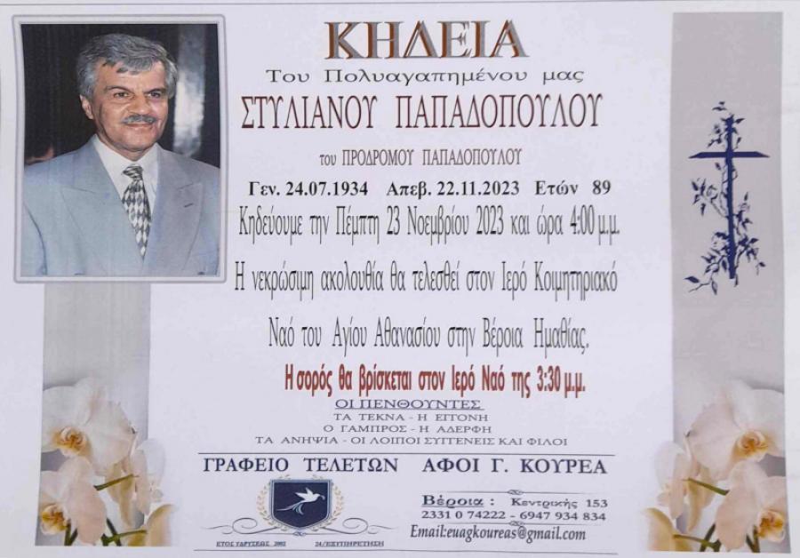 Κηδεύεται σήμερα Πέμπτη 23 Νοεμβρίου 2023 και ώρα 4.00 το απόγευμα, ο Στυλιανός, Προδρόμου, Παπαδόπουλος 89 ετών. Η νεκρώσιμη ακολουθία θα τελεσθεί στον Ιερό Ναό του Αγίου Αθανασίου (Κοιμητήρια) στη Βέροια.