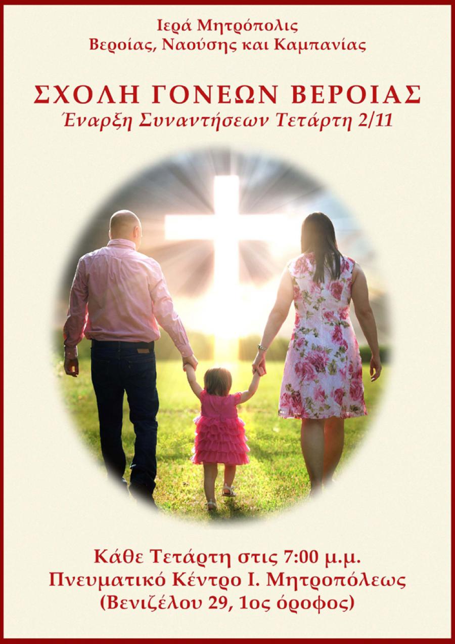 Τήν Τετάρτη 29 Νοεμβρίου στίς 7 τό ἀπόγευμα στό Πνευματικό Κέντρο τῆς Ἱερᾶς μας Μητροπόλεως (Βενιζέλου 29, 1ος ὄροφος) ὁμιλήτρια στή Σχολή Γονέων θά εἶναι ἡ κ. Λουκία Χατζηβασιλείου, λογοθεραπεύτρια - εἰδική παιδαγωγός, μέ θέμα: «Εἰδική προσέγγιση τῶν προβλημάτων συμπεριφορᾶς τῶν παιδιῶν. Τό διαδίκτυο στή ζωή τῶν ἐφήβων».