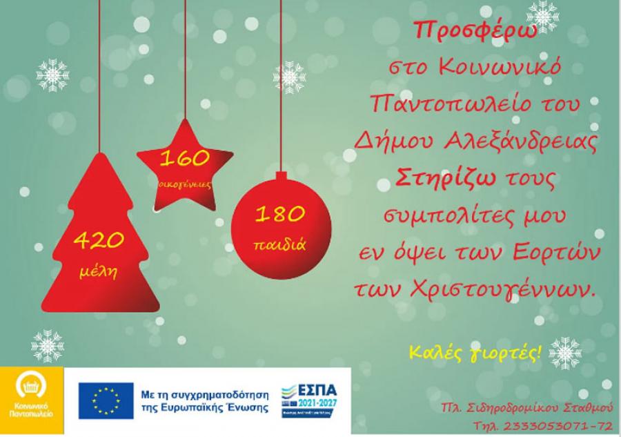 Λόγω των σοβαρών προβλημάτων διαβίωσης που αντιμετωπίζουν αυτές οι οικογένειες και τα οποία επιδεινώθηκαν δραματικά με τις συνεχείς ανατιμήσεις σε μια σειρά βασικών προϊόντων το τελευταίο διάστημα, o Αντιδήμαρχος της Διεύθυνσης Κοινωνικής Προστασίας, Παιδείας και Πολιτισμού του Δήμου Αλεξάνδρειας, Δριστάς Στέφανος και τα Στελέχη του Κοινωνικού Παντοπωλείου, εν όψει των εορτών των Χριστουγέννων, καλούν όλους τους Δημότες να προσφέρουν βασικά είδη διατροφής (ελαιόλαδο, γάλα εβαπορέ, όσπρια, ζυμαρικά, χαρτικά, απορρυπαντικά, αλλά και χριστουγεννιάτικα εδέσματα και γλυκά για μικρά παιδιά.