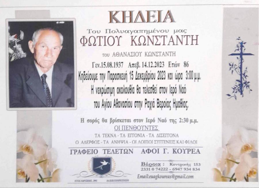Κηδεύεται σήμερα Παρασκευή 15 Δεκεμβρίου 2023 και ώρα 3.00 το μεσημέρι, ο Φώτιος, Αθανασίου, Κωνσταντής, 86 ετών. Η νεκρώσιμη ακολουθία θα τελεσθεί στον Ιερό Ναό Αγίου Αθανασίου στην Ραχιά Βέροιας. Η σορός θα βρίσκεται στον Ιερό Ναό στις 2.30 μ.μ.