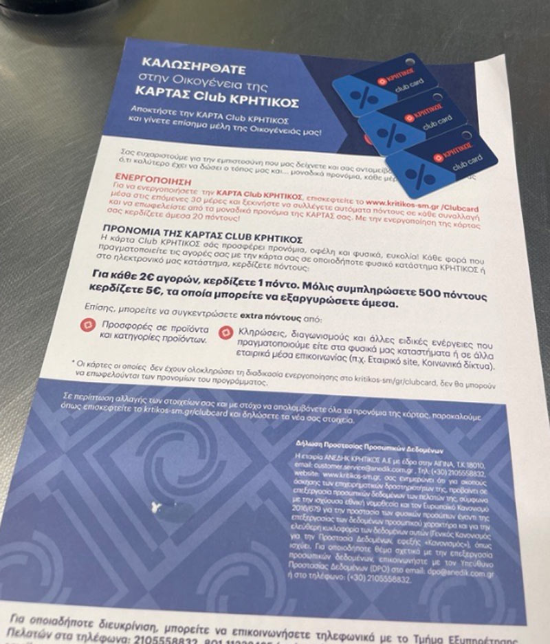 Για την παραλαβή της ειδικά προσημειωμένης εκπτωτικής κάρτας θα πρέπει να επισκεφτείτε τα γραφεία του Συλλόγου. Η κάρτα club ΚΡΗΤΙΚΟΣ είναι πλέον διαθέσιμη στα γραφεία μας για τα εγγεγραμμένα ή εν δυνάμει μέλη που θα ολοκληρώσουν την εγγραφή τους στο σύλλογο.