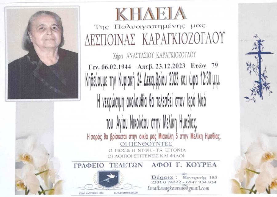 Κηδεύεται σήμερα Κυριακή 24 Δεκεμβρίου 2023 και ώρα 12.30 το μεσημέρι, η Δέσποινα, χήρα Αναστασίου, Καραγκιόζογλου, 79 ετών. Η νεκρώσιμη ακολουθία θα τελεσθεί στον Ιερό Ναό Αγίου Νικολάου στη Μελίκη Ημαθίας.