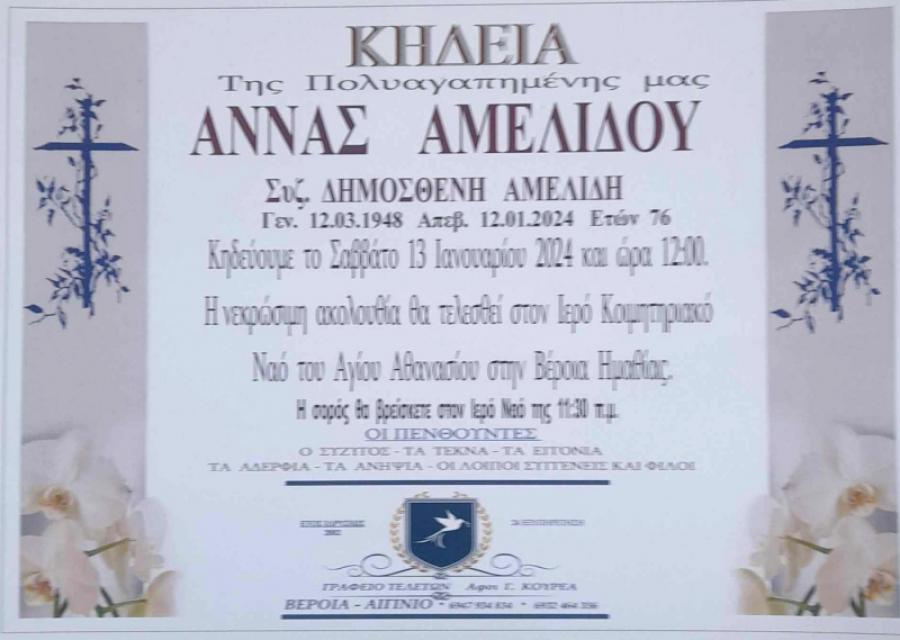 Κηδεύεται σήμερα Σάββατο 13 Ιανουαρίου 2024 και ώρα 12.00 το μεσημέρι, η Άννα, συζύγου Δημοσθένη, Αμελίδου, 76 ετών. Η νεκρώσιμη ακολουθία θα τελεσθεί στον Ιερό Ναό Αγίου Αθανασίου (Κοιμητήρια) στη Βέροια.