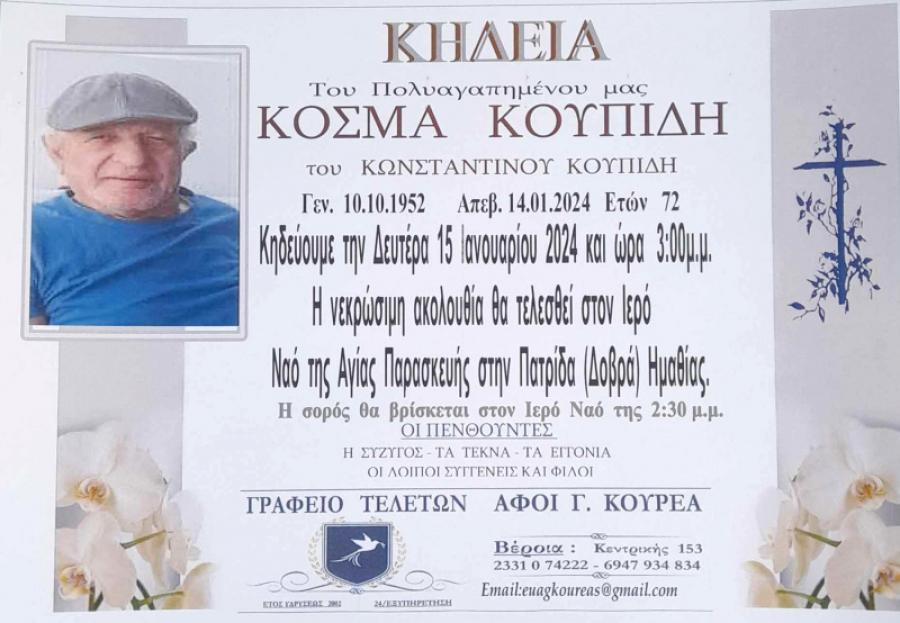 Κηδεύεται σήμερα Δευτέρα 15 Ιανουαρίου 2024 και ώρα 3.00 το απόγευμα, ο Κοσμάς, Κωνσταντίνου, Κουπίδης, 72 ετών. Η νεκρώσιμη ακολουθία θα τελεσθεί στον Ιερό Ναό Αγίας Παρασκευής στην Πατρίδα Δήμου Βέροιας.