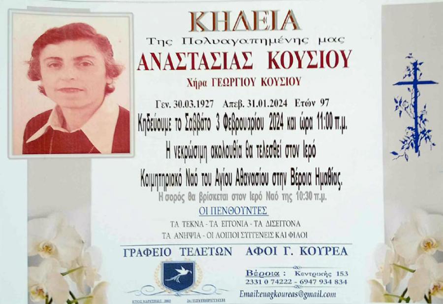 Κηδεύεται αύριο Σάββατο 03 Φεβροαυρίου 2024 και ώρα 11.00 το πρωί, η Αναστασία, χήρα Γεωργίου, Κούσιου, 97 ετών. Η νεκρώσιμη ακολουθία θα τελεσθεί στον Ιερό Ναό Αγίου Αθανασίου (Κοιμητήρια) στη Βέροια.