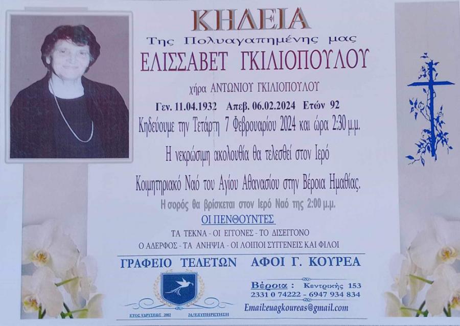 Κηδεύεται σήμερα Τετάρτη 07 Φεβροαυρίου 2024 και ώρα 2.30 το μεσημέρι, η Ελιςάβετ, χήρα Αντωνίου, Γκιλιοπούλου, 92 ετών. Η νεκρώσιμη ακολουθία θα τελεσθεί στον Ιερό Ναό Αγίου Αθανασίου (Κοιμητήρια) στη Βέροια.