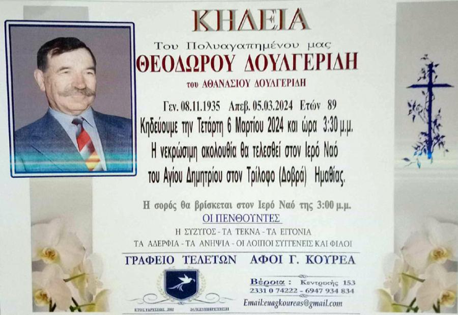 Κηδεύεται αύριο Τετάρτη 06 Μαρτίου 2024 και ώρα 3.30 το μεσημέρι, ο Θεόδωρος, Αθανασίου, Δουλγερίδης, 93 ετών. Η νεκρώσιμη ακολουθία θα τελεσθεί στον Ιερό Ναό Αγίου Δημητρίου στον Τρίλοφο Δήμου Βέροιας.