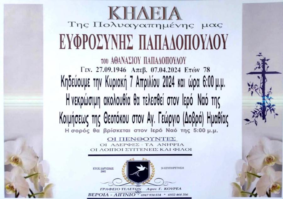 Κηδεύεται σήμερα Κυριακη 07 Απριλίου 2024 και ώρα 6.00 το απόγευμα, η Ευφροσύνη, Αθανασίου, Παπαδοπούλου, 78 ετών. Η νεκρώσιμη ακολουθία θα τελεσθεί στον Ιερό Ναό της Κοιμήσεως της Θεοτόκου στον Άγιο Γεώργιο (Δοβράς) Δήμου Βέροιας.