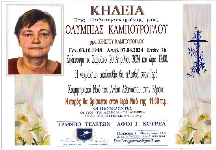 Κηδεύεται το Σάββατο 20 Απριλίου 2024 και ώρα 12.00 το μεσημέρι, η Ολυμπία, χήρα Χρήστου, Καμπούρογλου, 76 ετών. Η νεκρώσιμη ακολουθία θα τελεσθεί στον Ιερό Ναό του Αγίου Αθανασίου (Κοιμητήρια) στη Βέροια.