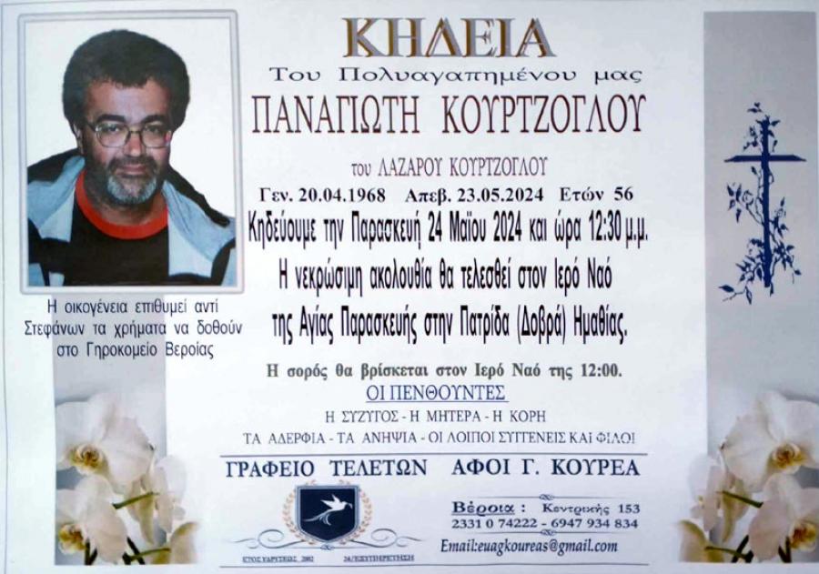 Κηδεύεται αύριο Παρασκευή 24 Μαϊου 2024 και ώρα 12.30 το μεσημέρι, ο Παναγιώτης, Λαζάρου, Κούρτζογλου, 56 ετών. Η νεκρώσιμη ακολουθία θα τελεσθεί στον Ιερό Ναό της Αγίας Παρασκευής στην Πατρίδα Βέροιας.