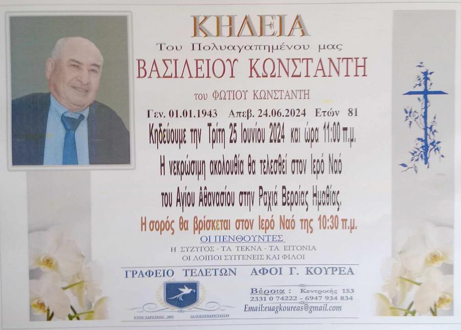 Κηδεύεται αύριο Τρίτη 25 Ιουνίου 2024 και ώρα 11.00 το πρωί, ο Βασίλειος, Φωτίου, Κωνσταντής, 81 ετών. Η νεκρώσιμη ακολουθία θα τελεσθεί στον Ιερό Ναό Αγίου Αθανασίου στην Ραχιά Δήμου Βέροιας. Η σορός θα βρίσκεται στον Ιερό Ναό στις 10.30 π.μ.
