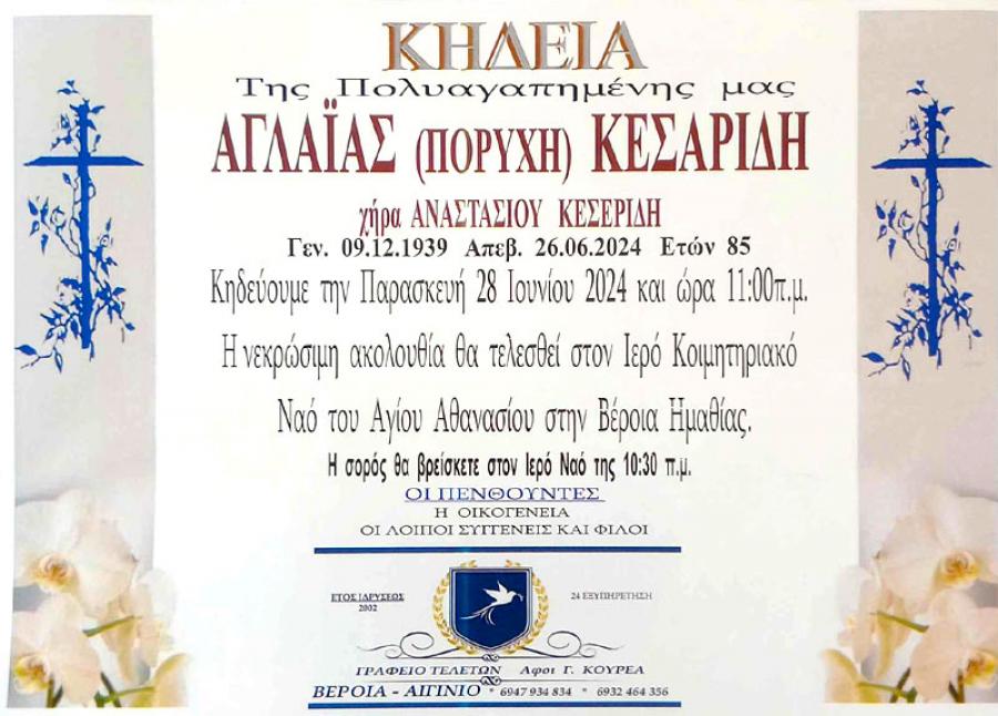 Κηδεύεται αύριο Παρασκευή 28 Ιουνίου 2024 και ώρα 11.00 το πρωί, η Αγλαϊα (Πορύχη), χήρα Αναστασίου, Κεσαρίδη, 85 ετών. Η νεκρώσιμη ακολουθία θα τελεσθεί στον Ιερό Ναό Αγίου Αθανασίου (Κοιμητήρια) στη Βέροια.