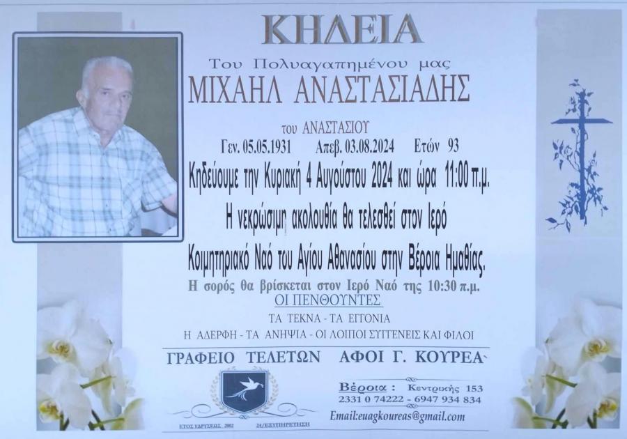 Κηδεύεται σήμερα Κυριακή 04 Αυγούστου 2024 και ώρα 11 το πρωί, ο Μιχαήλ, Αναστασίου, Αναστασιάδης, 93 ετών. Η νεκρώσιμη ακολουθία θα τελεσθεί στον Ιερό Ναό του Αγίου Αθανασίου (Κοιμητήρια) στη Βέροια.