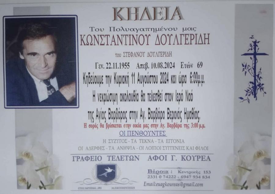 Κηδεύεται σήμερα Κυριακή 11 Αυγούστου 2024 και ώρα 6.00 το απόγευμα, ο Κωνσταντίνος, Στεφάνου, Δουλγερίδης, 69 ετών. Η νεκρώσιμη ακολουθία θα τελεσθεί στον Ιερό Ναό Αγίας Βαρβάρας στην Αγία Βαρβάρα Δήμου Βέροιας.