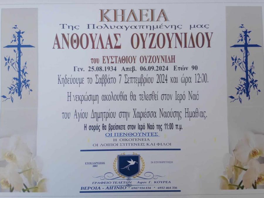 Κηδεύεται σημερα Σάββατο 07 Σεπτεμβρίου 2024 και ώρα 12 το μεσημέρι, η Ανθούλα, Ευσταθίου, Ουζουνίδου, 90 ετών. Η νεκρώσιμη ακολουθία θα τελεσθεί στον Ιερό Ναό του Αγίου Δημητρίου στην Χαρίεσσα Δημου Νάουσας.