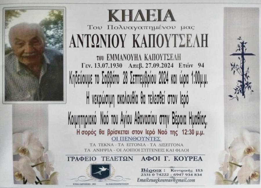 Κηδεύεται σήμερα Σάββατο 28 Σεπτεμβρίου 2024 και ώρα 1.00 το μεσημέρι, ο Αντώνιος, Εμμανοήλ, Καπουτσέλης, 94 ετών. Η νεκρώσιμη ακολουθία θα τελεσθεί στον Ιερό Ναό του Αγίου Αθανασίου (Κοιμητήρια) στη Βέροια.