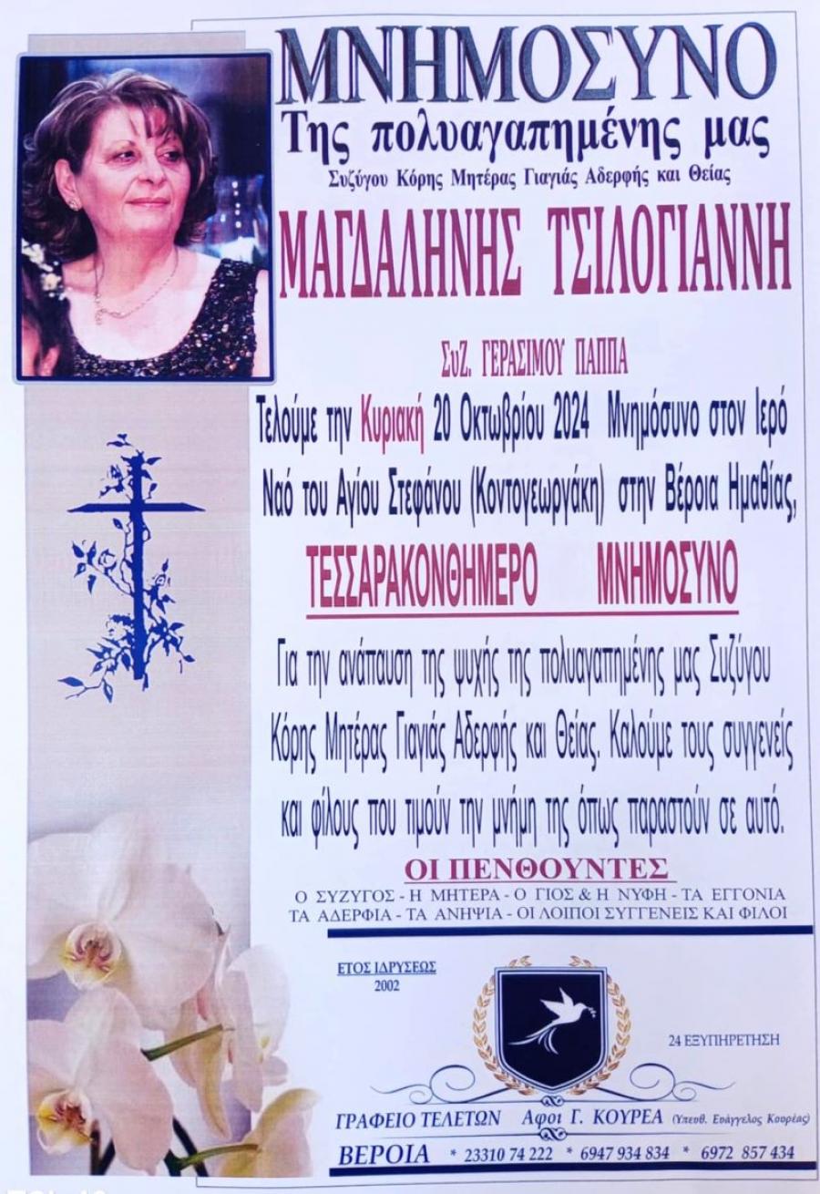 Την Κυριακή το Τεσσαρακονθήμερο μνημόσυνο της Μαγδαληνής Τσιλογιάννη