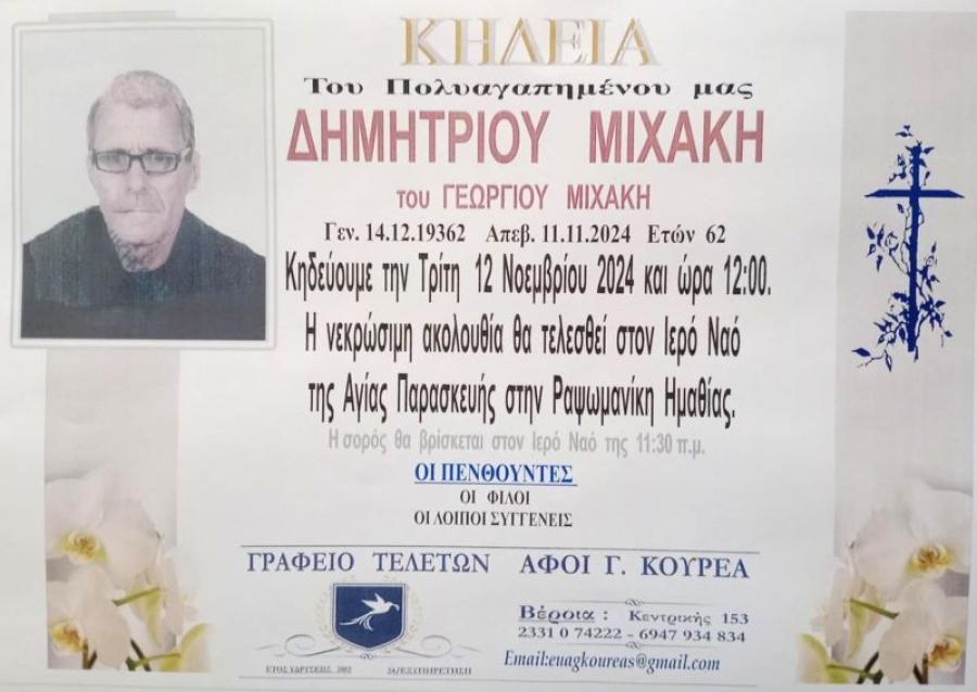 Κηδεύεται αύριο Τρίτη 12 Νοεμβρίου 2024 και ώρα 12,00 το μεσημέρι, ο Δημήτριος, Γεωργίου, Μιχάκης, 62 ετών. Η νεκρώσιμη ακολουθία θα τελεσθεί στον Ιερό Ναό Αγίας Παρασκευής στην Ραψωμανίκη Ημαθίας. Η σορός θα βρίσκεται στον Ιερό Ναό στις 11.30 π.μ..