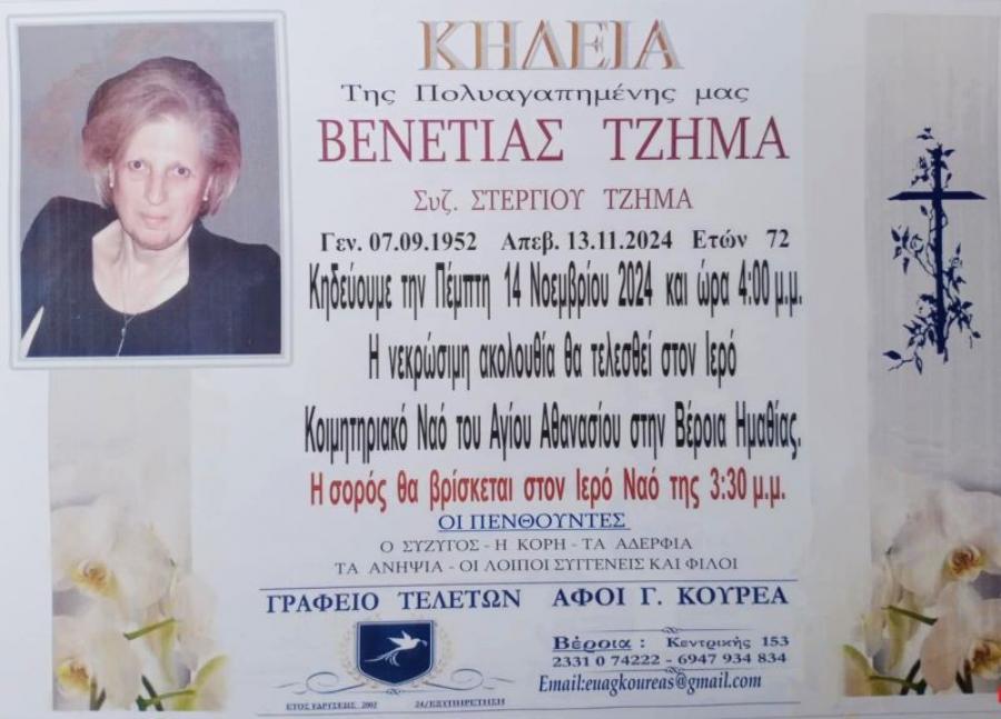 Κηδεύεται σήμερα Πέμπτη 14 Νοεμβρίου 2024 και ώρα 4,00 το απόγευμα, η Βενετία, σύζ. Στέργιου, Τζήμα, 72 ετών. Η νεκρώσιμη ακολουθία θα τελεσθεί στον Ιερό Ναό Αγίου Αθανασίου (Κοιμητήρια) στη Βέροια. Η σορός θα βρίσκεται στον Ιερό Ναό στις 3.30 μ.μ..