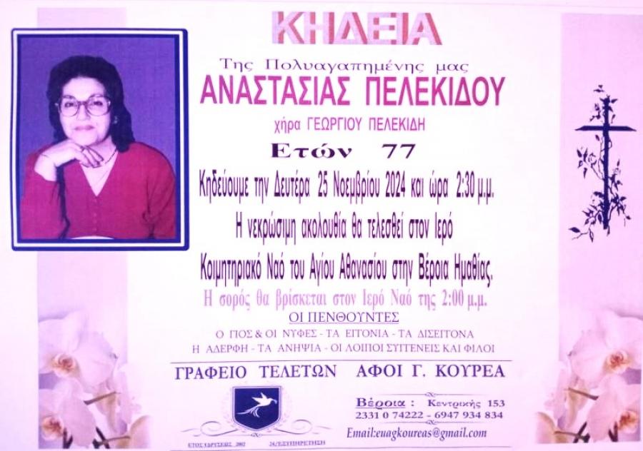 Κηδεύεται σήμερα Δευτέρα 25 Νοεμβρίου 2024 και ώρα 2.30 το μεσημέρι, η Αναστασία, χήρα Γεωργίου, Πελεκίδου, 77 ετών. Η νεκρώσιμη ακολουθία θα τελεσθεί στον Ιερό Ναό του Αγίου Αθανασίου (Κοιμητήρια) στη Βέροια.