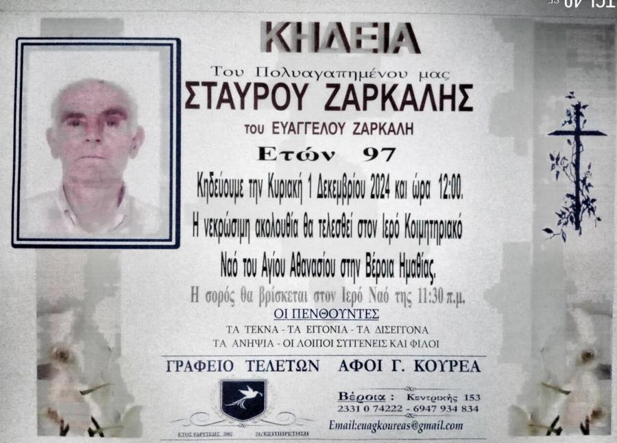 Κηδεύεται αύριο Κυριακή 01 Δεκεμβρίου 2024 και ώρα 12 το μεσημέρι, ο Σταύρος, Ευαγγέλλου, Ζαρκαλής, 97 ετών. Η νεκρώσιμη ακολουθία θα τελεσθεί στον Ιερό Ναό του Αγίου Αθανασίου (Κοιμητήρια) στη Βέροια.