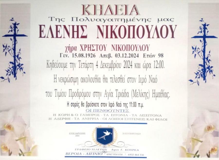 Κηδεύεται αύριο Τετάρτη 04 Δεκεμβρίου 2024 και ώρα 12 το μεσημέρι, η Ελένη, χήρα Χρήστου, Νικοπούλου, 98 ετών. Η νεκρώσιμη ακολουθία θα τελεσθεί στον Ιερό Ναό του Τιμίου Προδρόμου στην Αγία Τριάδα (Μελίκης) Ημαθίας.