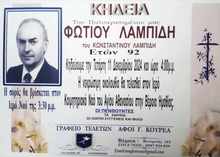 Κηδεύεται σήμερα Τετάρτη 11 Δεκεμβρίου 2024 και ώρα 4.00 το απόγευμα, ο Φώτιος, Κωνσταντίνου, Λαμπίδης, 92 ετών. Η νεκρώσιμη ακολουθία θα τελεσθεί στον Ιερό Ναό του Αγίου Αθανασίου (Κοιμητήρια) στη Βέροια.