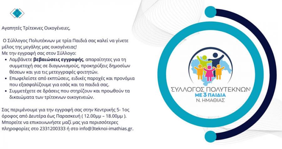 Γραφτείτε μέλος στον Σύλλογο Τριτέκνων Ημαθίας και επωφεληθείτε τα προνόμια