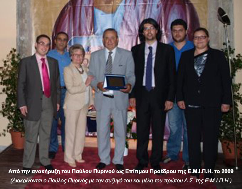 Ο Παύλος Πυρινός υπήρξε έμπρακτος και ένθερμος υποστηρικτής της Εταιρείας από τα πρώτα χρόνια της ίδρυσής της. Υποστήριξε οικονομικά διάφορες δράσεις της Εταιρείας, προσέφερε τα έσοδα από εκδόσεις του στην Ε.Μ.Ι.Π.Η. και ήταν πάντα παρών στις εκδηλώσεις και τις Γενικές Συνελεύσεις, αναλαμβάνοντας διάφορους ρόλους και αρμοδιότητες (εισηγητής σε ημερίδες, πρόεδρος ελεγκτικής επιτροπής κ.α.). Αναγνωρίζοντας την πολύπλευρη συνεισφορά του, η Ε.Μ.Ι.Π.Η. τον ανακήρυξε Επίτιμο Πρόεδρό της το 2009, θέση που διατήρησε έως τέλους.