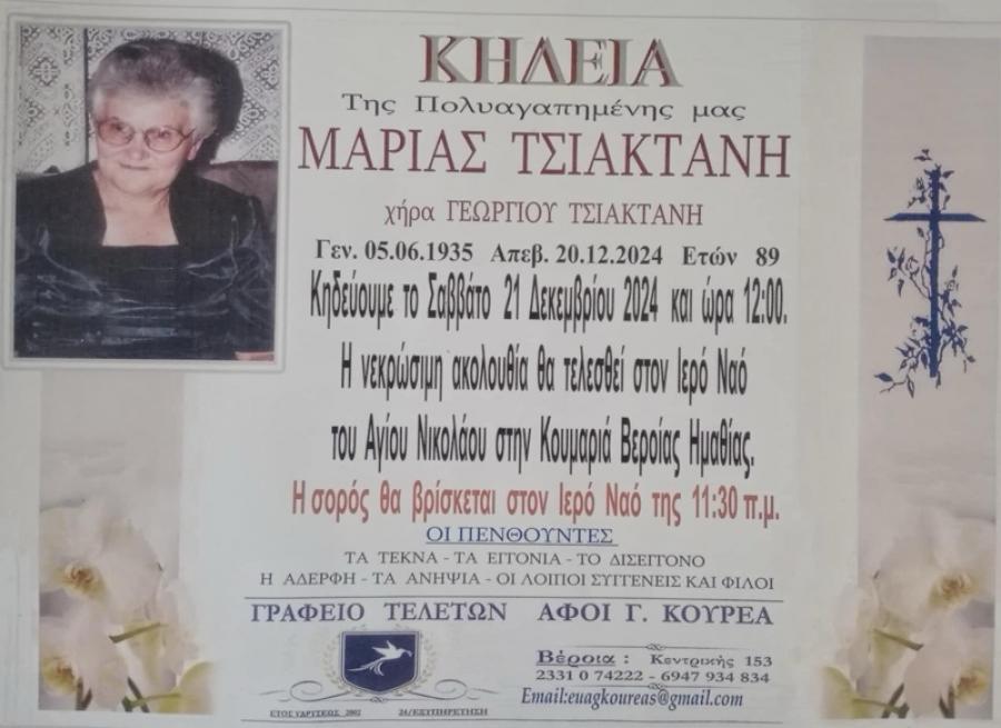 Κηδεύεται σήμερα Σάββατο 21 Δεκεμβρίου 2024 και ώρα 12 το μεσημέρι , η Μαρία , χήρα Γεωργίου, Τσιακτάνη, 89 ετών. Η νεκρώσιμη ακολουθία θα τελεσθεί στον Ιερό Ναό του Αγίου Νικολάου στην Κουμαριά Δήμου Βέροιας.